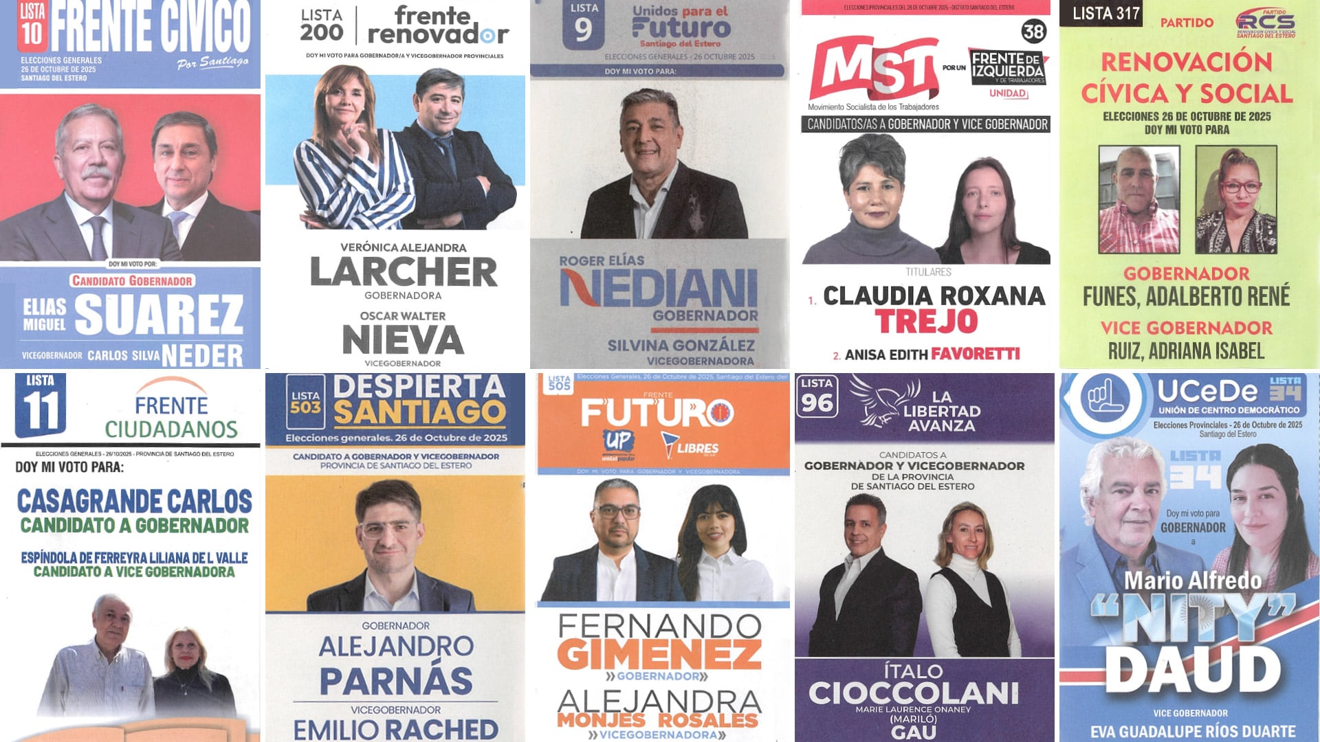 También se presentan 10 candidatos a gobernador para suceder a Gerardo Zamora, del Frente Cívico Santiagueño. Son el oficialista Elías Suárez, mano derecha del mandatario provincial; el libertario Ítalo Cioccolani, actual titular de la ANSES en la provincia va por LLA; y el radical Alejandro Parnás, que se presenta por Despierta Santiago (una coalición de PRO, UCR disidente y Movimiento Viable).