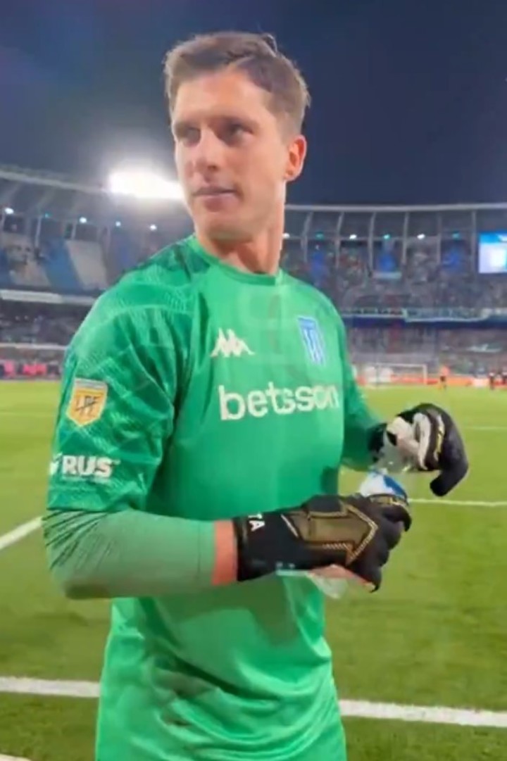 El marcador reflejaba un 2-1 a favor de Racing desde la vía de los 12 pasos. Fue en ese momento cuando el jefe de los tres palos se dirigió verbalmente a un alcanzapelotas que estaba detrás de su arco: » Dame el agua bendita«. El ex arquero de Banfield y con último paso por la Selección, tragó de la botella y segundos después le tapó el penal a Joaquín Laso. Anteriormente había hecho lo mismo previo al remate Tomas Cardona, el que también frenó el arquero.