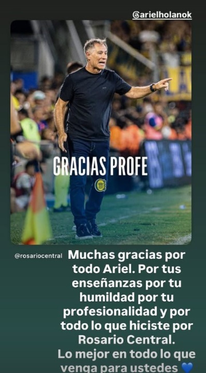 El campeón del mundo en Qatar 2022 fue uno de los futbolistas que se expresó en redes sociales tras la salida del entrenador. «Muchas gracias por todo, Ariel. Por tus enseñanzas, por tu humildad, por tu profesionalidad y por todo lo que hiciste por Rosario Central. Lo mejor en todo lo que venga para ustedes», escribió Ángel, en un posteo en su Instagram que tituló: «Gracias, Profe».