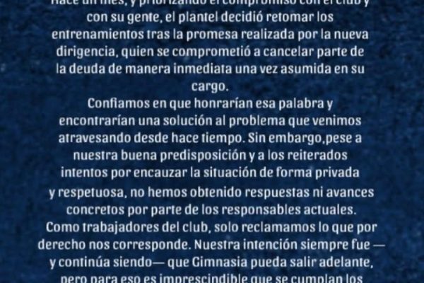 04/12/2025 11:00hs. Actualizado al 04/12/2025 11:21hs. Gimnasia no se entrenó a cuatro días del clásico platense que definirá un lugar en la final del Torneo Clausura, en medio de una crisis interna que el propio plantel hizo pública. Los jugadores difundieron un comunicado en el que reclaman sueldos adeudados (en algunos casos, de hasta cuatro…