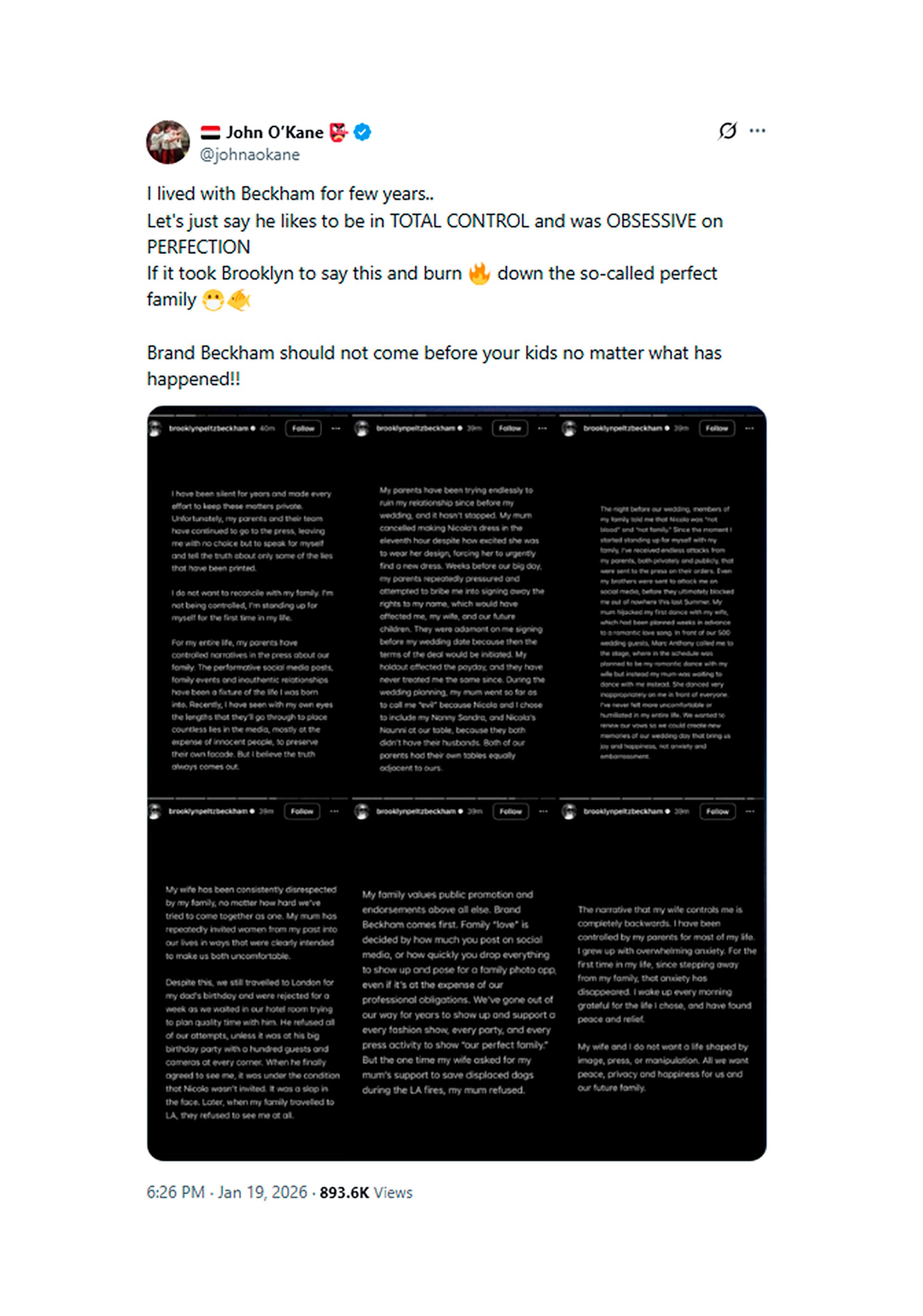 O’Kane convivió con David Beckham durante su paso por las categorías juveniles del Manchester United. En una publicación en X (plataforma antes conocida como Twitter), O’Kane expresó: “Viví con Beckham durante algunos años. Digamos que le gusta tener el CONTROL TOTAL y era OBSESIONARIO con la PERFECCIÓN. Si Brooklyn tuvo que decir esto y quemar a la supuesta familia perfecta, la marca Beckham no debería estar por encima de tus hijos, pase lo que pase”.