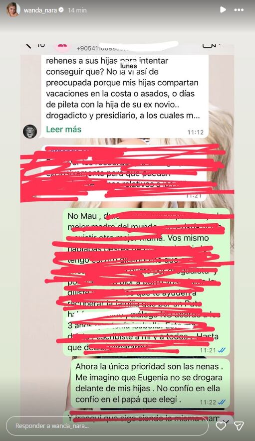 Entre las capturas difundidas, la conductora expresa en uno de los mensajes. “Ahora la única prioridad son las nenas. Me imagino que Eugenia no se drogará delante de mis hijas. No confío en ella, confío en el papá que elegí”. En otro tramo del intercambio, Icardi aparece preocupado por el ambiente al que podrían estar expuestas sus hijas y apuntó contra el círculo cercano de su expareja: “No la vi así de preocupada porque mis hijas compartan vacaciones en la costa o asados, o días de pileta con la hija de su ex novio… drogadicto y presidiario, a los cuales…”.
