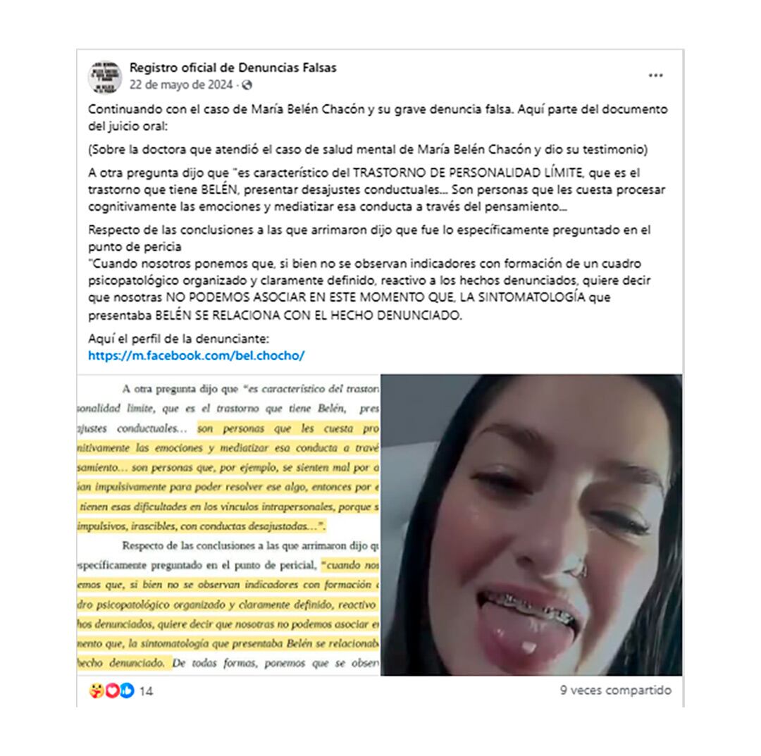 Entre los episodios más graves relatados se encuentra la creación de una página de Facebook titulada “Registro oficial de Denuncias Falsas”, donde se publican imágenes suyas acompañadas por mensajes injuriantes y referencias directas a la causa judicial contra su hermano. Según indicó, ese espacio digital sería administrado por varias personas, lo que dificulta la identificación de los responsables.