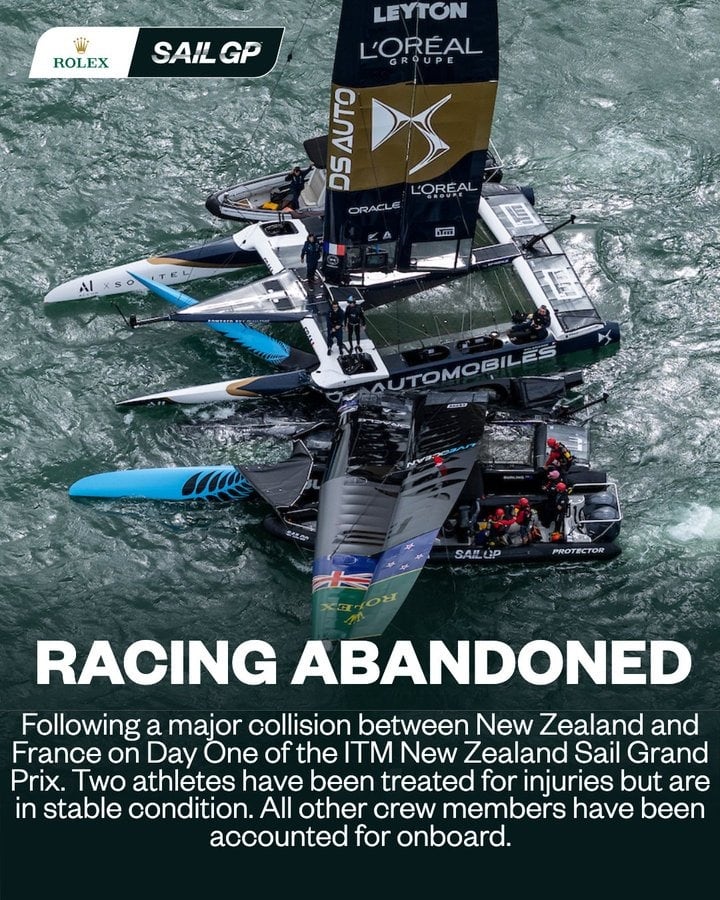 La regata se suspendió tras una importante colisión entre Nueva Zelanda y Francia en el primer día del Gran Premio de Vela ITM de Nueva Zelanda. Próximamente habrá más información”, informaron desde la organización en los primeros minutos de este sábado en referencia al segundo de los 13 eventos del calendario.