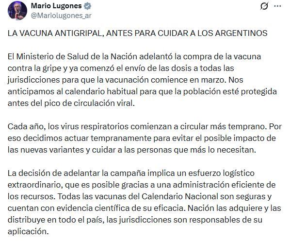 La medida responde a la detección de una nueva variante de influenza —la H3N2, subclado K— y al incremento anticipado en la circulación de virus respiratorios, según detallaron a Infobae desde la cartera sanitaria que dirige el médico cardiólogo Mario Lugones.