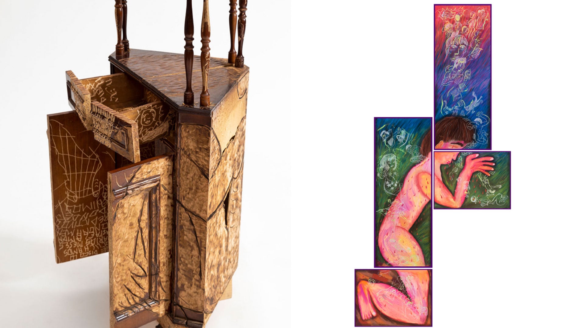 Mazzucca (Santa Fe, 1997) aporta a la muestra una mirada radical sobre lo cotidiano, donde dibujos y muebles intervenidos transportan la intimidad doméstica al campo del arte contemporáneo. El trabajo manual sobre la madera y la aplicación de pigmentos resignifican los objetos, desplazándolos de su función utilitaria a una dimensión contemplativa y simbólica.