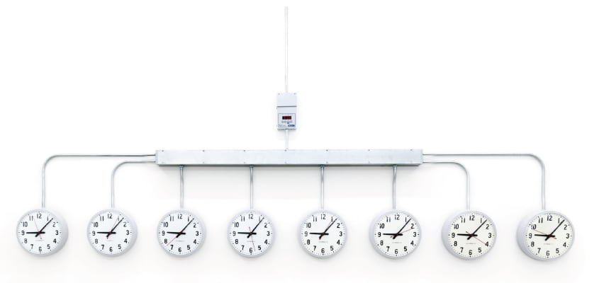 Entre ellas, National Times, ocho relojes analógicos de escuela avanzan sincronizados por un “maestro” digital, en un sistema montado para autodestruirse, y al mismo tiempo, para interrogarse el vínculo entre tiempo, trabajo y valor económico.