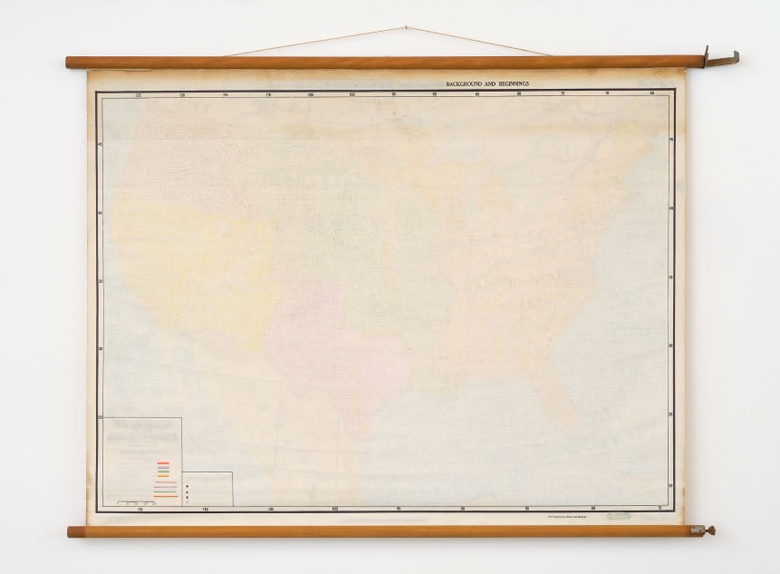 La muestra se completa con una serie de mapas lijados y tapices en jacquard que giran sobre una idea similar: la erosión de las fronteras, los sistemas de organización y el intento —siempre fallido— de recomponer lo borrado. Ante la caída de la cartografía tradicional, desplazada por los sistemas GPS, Woodgate reduce antiguos mapas escolares a masas continentales sin geopolitica posible. En esa operación, insinúa lo que define como una “implosión social, política y económica”.
