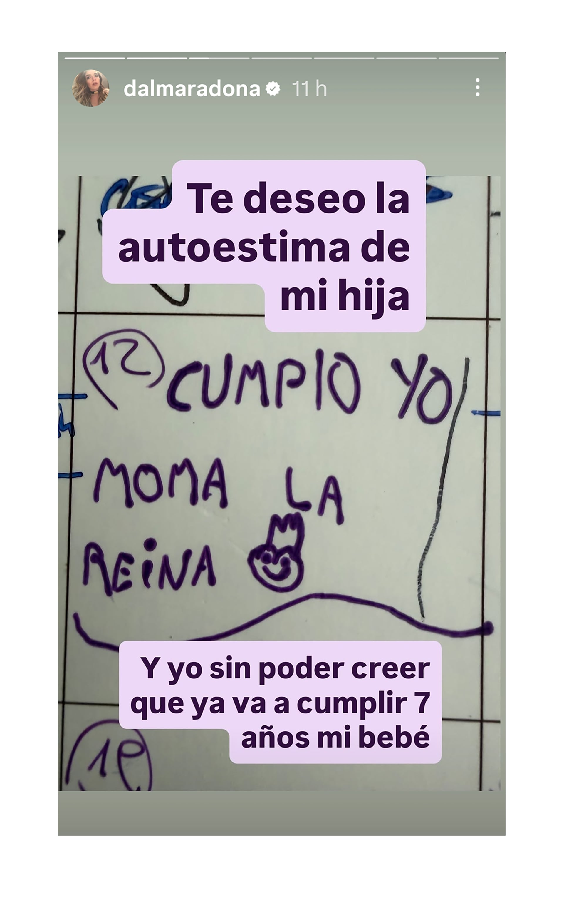 “Hoy se cumplen 7 años del mejor día de mi vida”, afirmó la actriz, al recordar el nacimiento de Roma. “De la ansiedad de conocerte y estar tan asustada de no poder hacerlo bien. De las ganas inexplicables de conocer tu carita, la más hermosa del mundo. De amarte desde el momento que me enteré que estaba embarazada”, expresó con profunda emoción la hija de Diego Maradona y Claudia Villafañe.