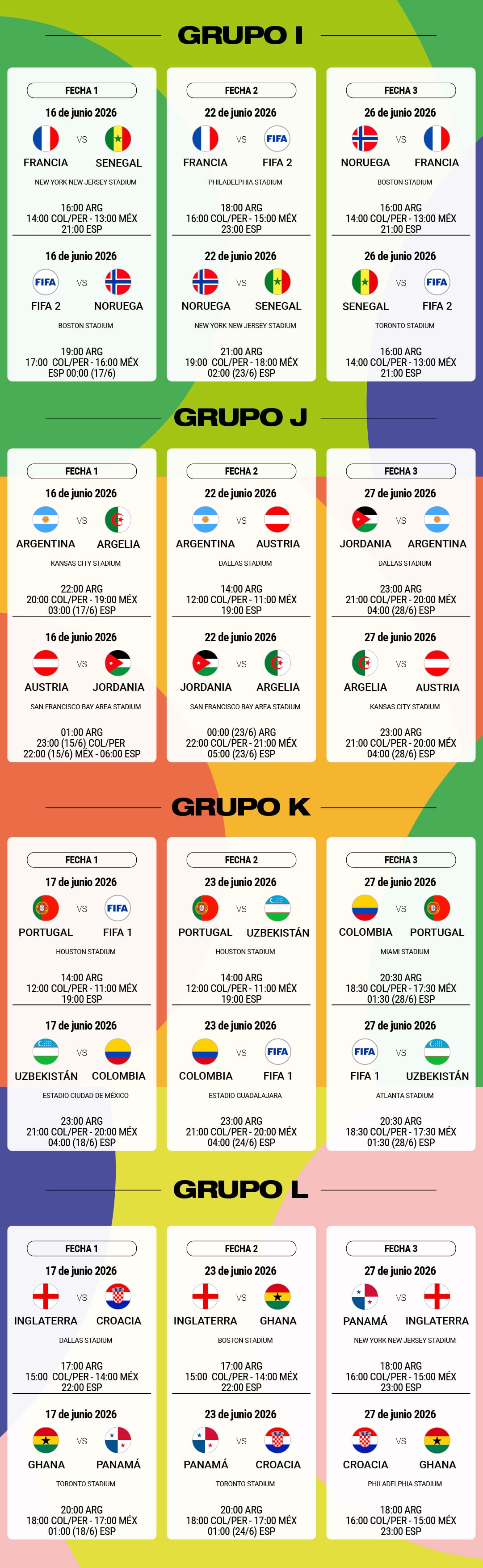 DÍAS Y HORARIOS DE TODOS LOS PARTIDOS DE FASE DE GRUPOS DEL MUNDIAL 2026
