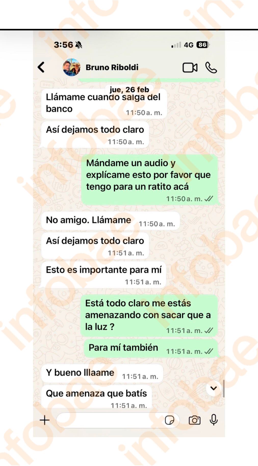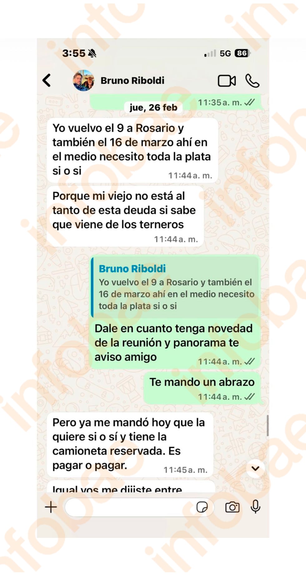 Según consta en los mensajes a los que accedió Infobae, todo comenzó el pasado 26 de febrero, un día después de la presunta venta de 161 vacas a un campo de una empresa importante de Santa Fe y el traslado de los animales a un campo ubicado en la localidad de Chabás. En el intercambio, se lee que Riboldi pone: “Yo vuelvo el 9 a Rosario y también el 16 de marzo; ahí en el medio necesito toda la plata si o si”, y sigue: “Porque mi viejo no está al tanto de esta deuda si sabe que viene de los terneros”.