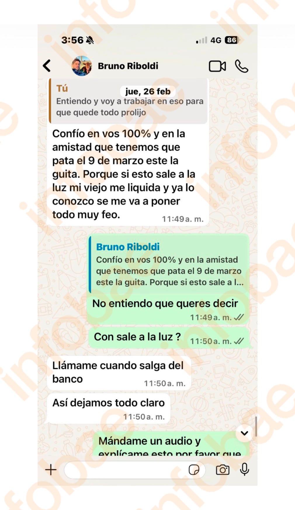 Casi a continuación, escribió: “Confío en vos 100% y en la amistad que tenemos que pata el 9 de marzo este la guita. Porque si esto sale a la luz mi viejo me liquida y ya lo conozco se me va a poner todo muy feo (sic)”.