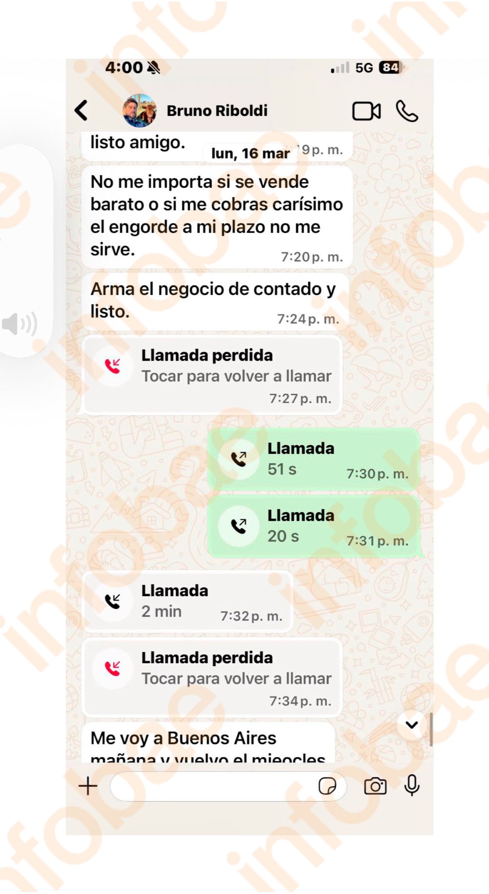 “No me importa si se vende barato o si me cobras carísimo el engorde a mi plazo no me sirve. Arma el negocio de contado y listo”, señala Riboldi en otro mensaje.