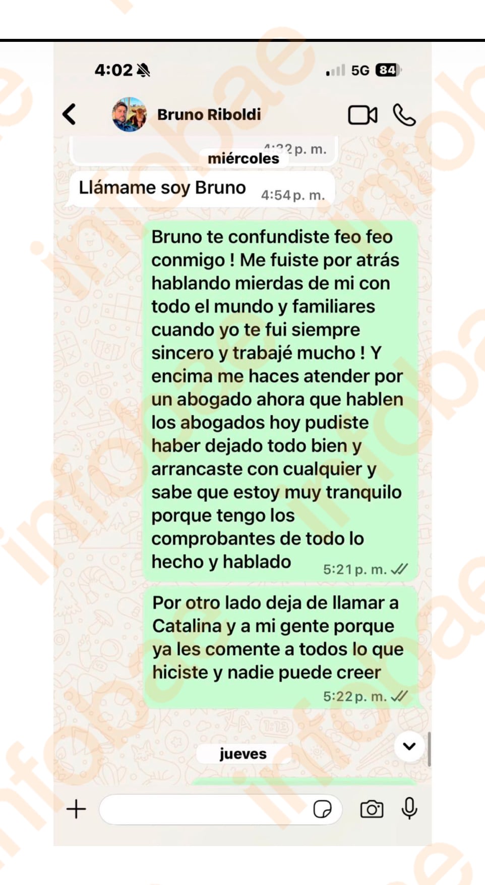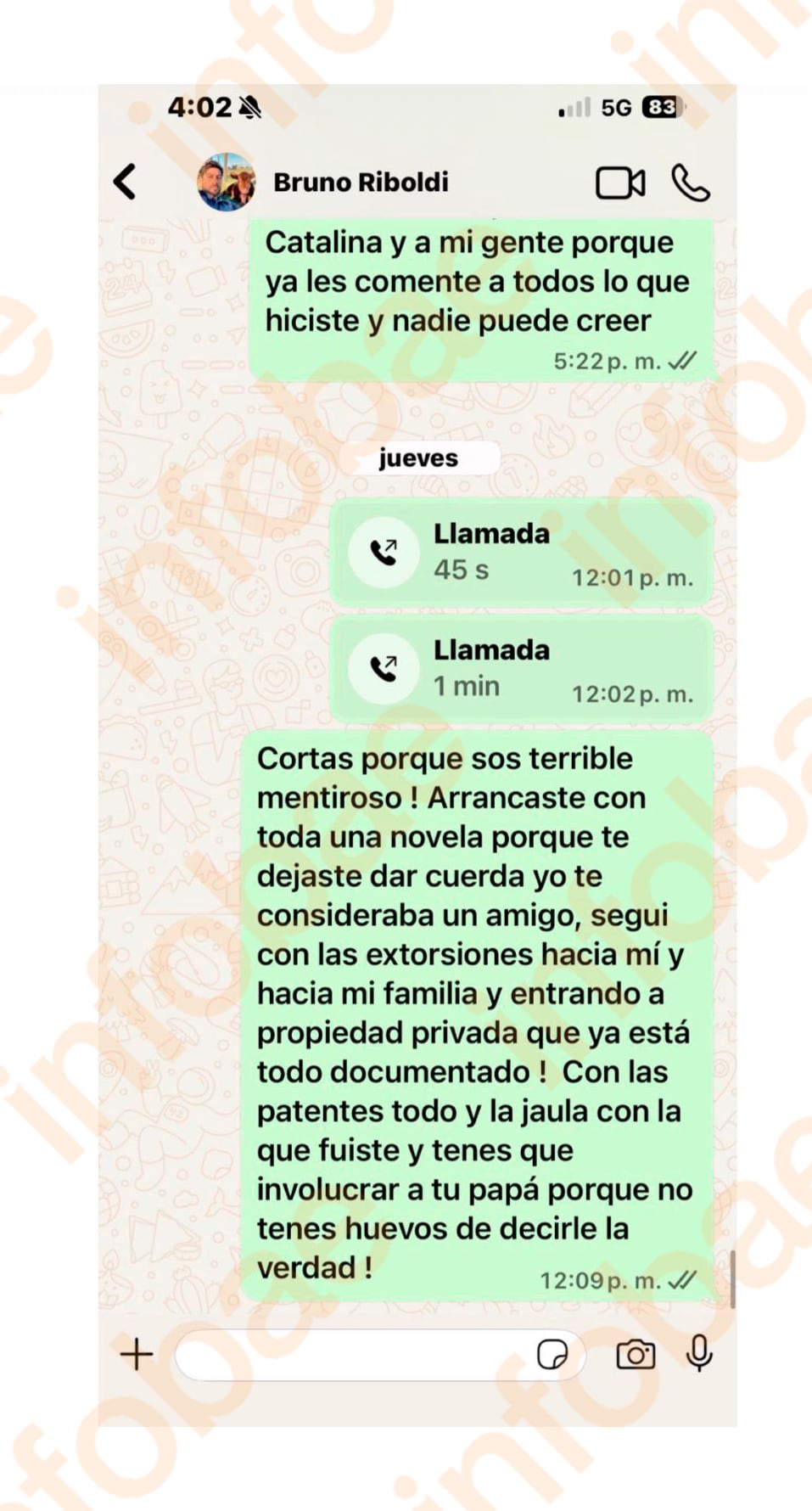 El inconveniente en cuestión apareció el lunes 16 de marzo, cuatro días antes de la publicación del video que alcanzó seis millones de reproducciones, con la denuncia pública de Riboldi sobre el robo de 190 animales de su campo. En el intercambio, ambos hablan de una presunta plata que debía estar lista para cobrar en esa fecha, a lo que Coscia aclaró: “Te dije por la tarde y el horario bancario es hasta la 1:15 en Rosario no las 15 hrs, estoy haciendo un movimiento grande para ya dejar todo saldado y cerrado y una parte la cobro en una consignataria bs as por eso te dije que vayas tranquilo y que te avisaba”.