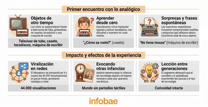 La experiencia dejó frases para el recuerdo y reacciones espontáneas. “Me cuesta mucho poner la hoja porque no sabíamos cómo”, confesó Benja. Pergolini, entre risas, remató: “Vos estás acostumbrado a que haya un botón y haga… No, en esta época todo había que hacerlo uno. No había cosas automáticas”. Los chicos, que nunca habían visto un disco de vinilo ni un VHS, se maravillaron con la mecánica de los objetos y el ritual que implicaba cada acción cotidiana.