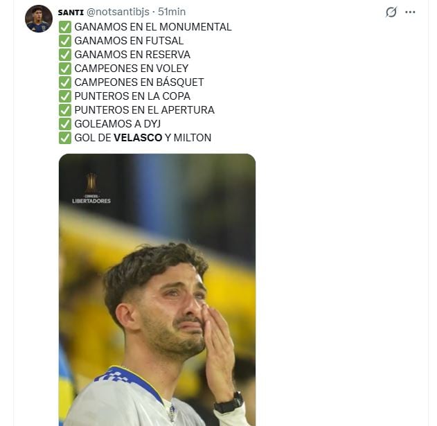 Las cargadas a River Plate tampoco faltaron. Los usuarios aprovecharon la ocasión para recordar la reciente victoria en el Superclásico y sumar bromas sobre la diferencia de resultados entre ambos equipos.